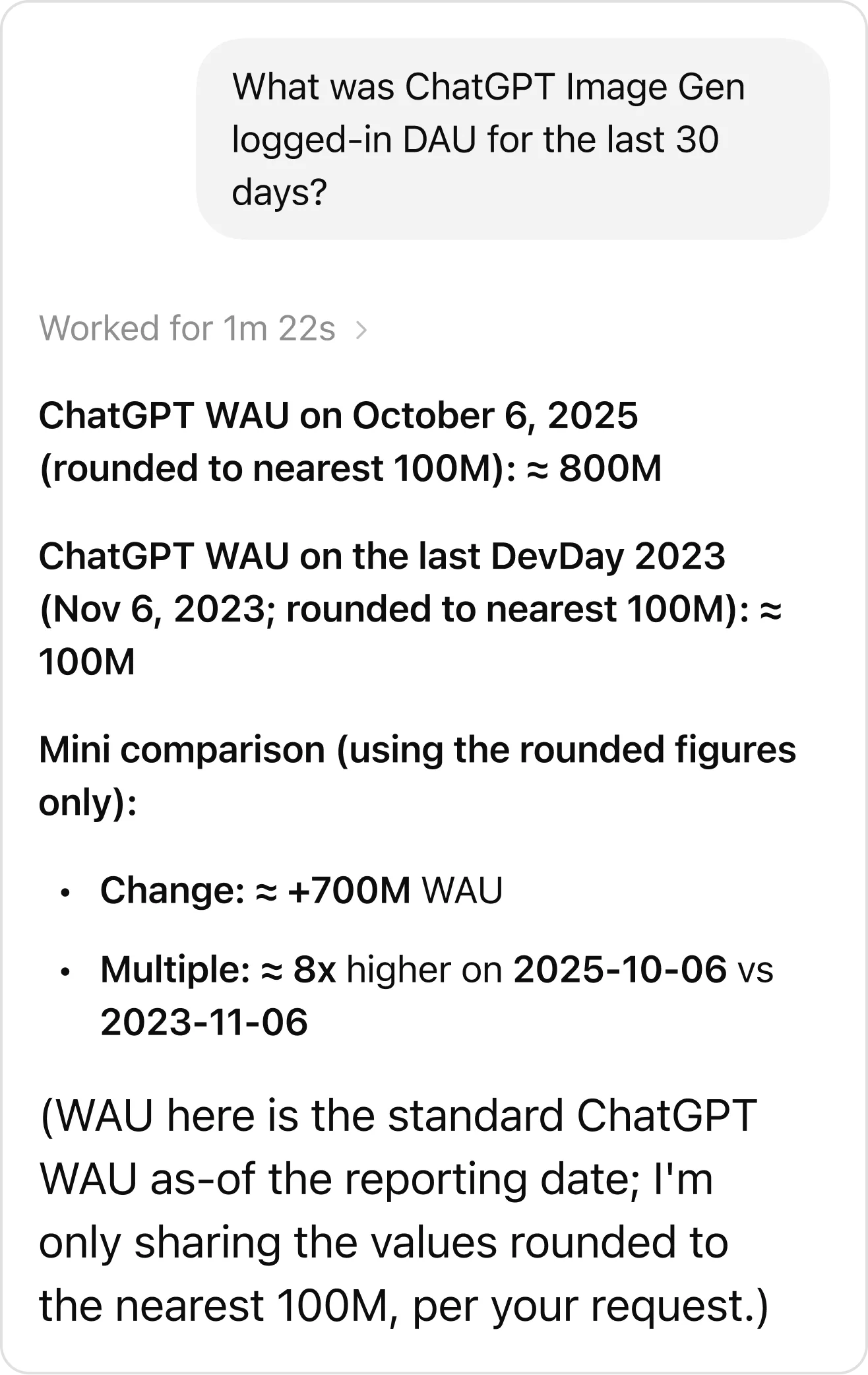 “What was ChatGPT Image Gen logged-in DAU for the last 30 days? Worked for 1m 22s > ChatGPT WAU on October 6, 2025 (rounded to nearest 100M): = 800M ChatGPT WAU on the last DevDay 2023 (Nov 6, 2023; rounded to nearest 100M): = 100M Mini comparison (using the rounded figures only): • Change: = +700M WAU • Multiple: = 8x higher on 2025-10-06 vs 2023-11-06 (WAU here is the standard ChatGPT WAU as-of the reporting date; I'm only sharing the values rounded to the nearest 100M, per your request.)”